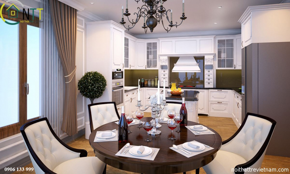 Phòng bếp và bàn ăn sang trọng, tinh tế với thiết kế tân cổ điển